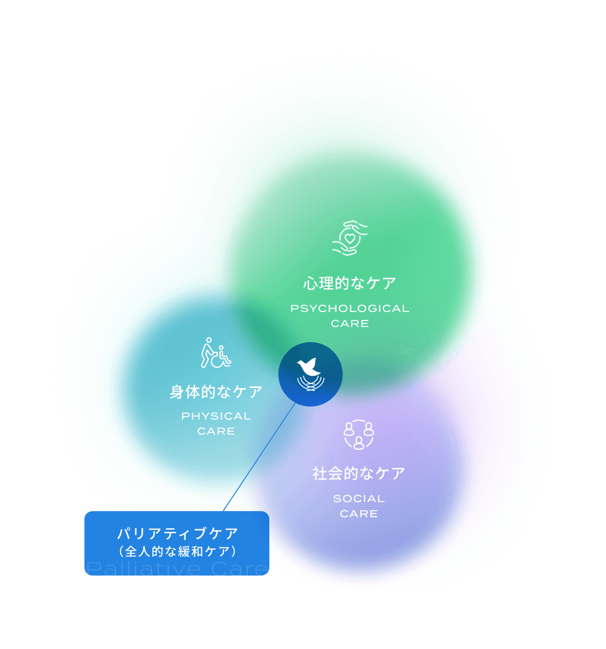 QOL(生活の質)というものは、身体的なケアだけで向上できるものではありません。心理的・社会的・霊的な問題にまでアプローチした全人的な緩和ケア=パリアティブケアを、お一人おひとりに合わせてご提供することによって、真に「要看護期が幸せな場所」を創り上げていきます。