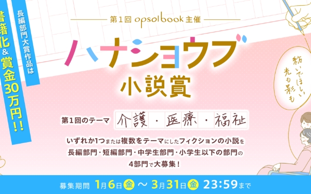 opsol bookは、独自の小説賞である「ハナショウブ小説賞」を定期開催しています。医療・介護・福祉をテーマにした部門も設ける同賞を受賞した作品は、opsol bookによる書籍化や電子書籍化を実現。また、賞金の贈呈や各種メディアへの掲載などにより、情熱ある作家の飛躍を後押ししています。